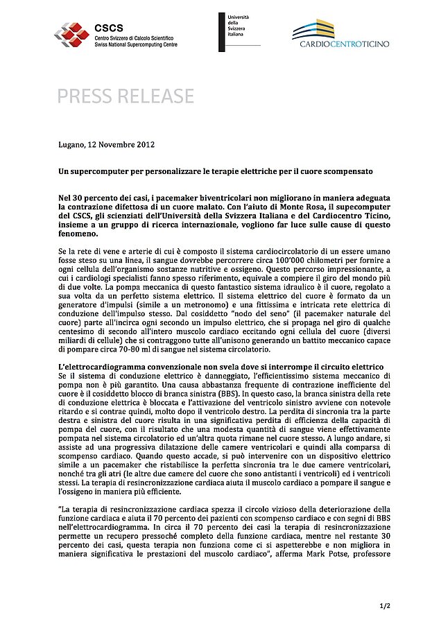 The project is a joint initiative of Mark Potse, a guest professor at the Università della Svizzera italiana; Rolf Krause, Director of the Institute of Computational Science at the Università della Svizzera italiana; Angelo Auricchio, Director of the Clinical Electrophysiology Programme at the Cardiocentro Ticino; and scientists from the Politecnico Milano and Maastricht University. The international collaboration is funded by the “Iniziativa Ticino in Rete”, funded by the Dipartimento dell’educazione, della cultura e dello sport (DECS).