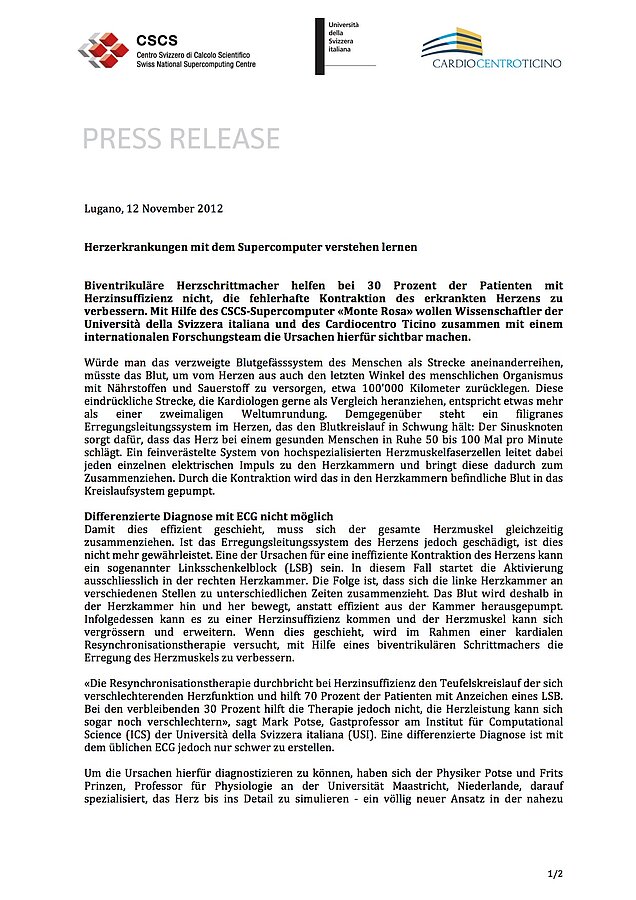 “Modern simulation methods coupled with supercomputers offer us new insights into physical, or in this case medical, processes,” says Rolf Krause, Director of the ICS. “With the interdisciplinary approach in the computational sciences, mathematicians, computer scientists and physicians can work hand in hand to improve the existing therapies for heart disease and develop new ones in the long run.”