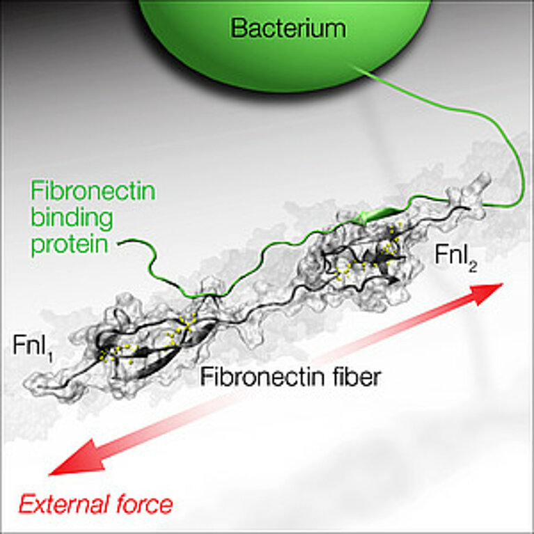 They succeeded in this with the help of a method developed by the scientist and her team a few years ago, which makes the degree of stretching of the fibronectin visible through colours. However, since it is difficult to carry out binding studies in cell cultures, the researchers “built” a special experimental set-up in which they extracted fibronectin fibres and applied them to elastic substrates. Doctoral student Mamta Chabria was able to use this to show that the processes occurring with stretched fibronectin fibres in the presence of bacterial adhesion molecules are the same as those taking place in the model.