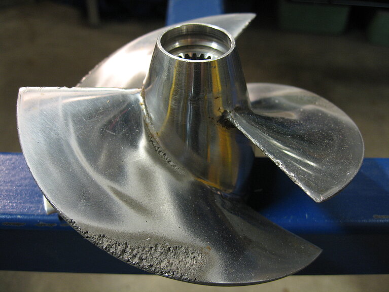 Image above: Cavitation occurring in a propeller: The formation and subsequent collapse of minute water bubbles (visible in the image on the right) can inflict serious damage on the material. (Image: Wikimedia Commons, Rafael Golf)