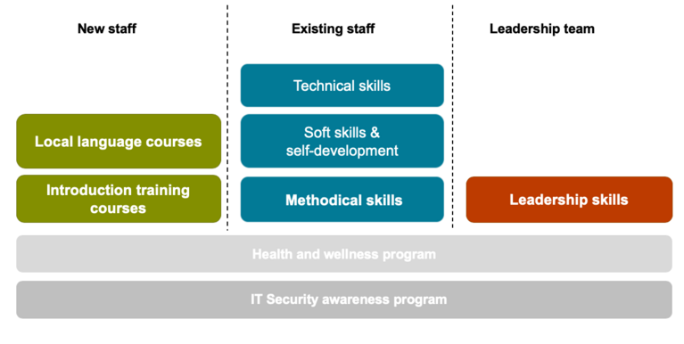 - Leadership team – The leadership team is expected to keep its leadership skills up to date. Example of courses are working with cultural diversity or agile project management.