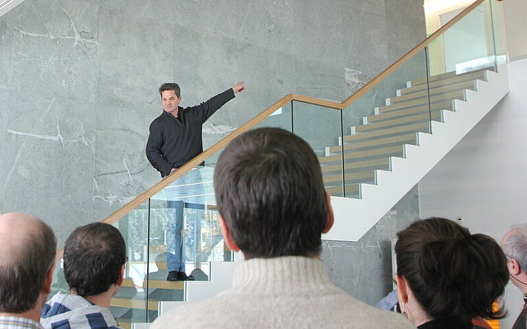 In front of the computer building stands the modern, five-storey office block into which the approximately 50 employees of CSCS have recently moved. It was built to meet the Minergie eco-standard and is a very contemporary, simple construction, created using materials that do not contain harmful substances. From the reception area on the ground floor, the staircase leading up to the offices is clad in green Andeer gneiss. The stone is emblematic for the twenty-year history of CSCS, from the choice of the site to the development of CSCS over the last five years.
