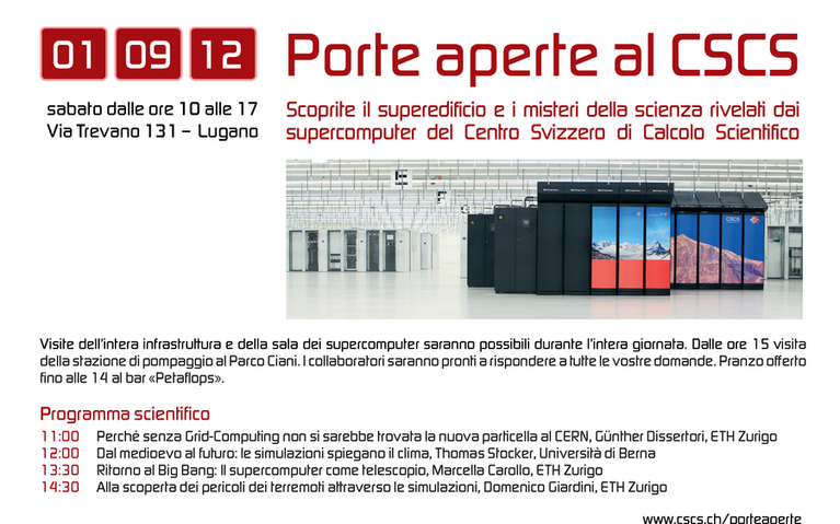 Per celebrare l'inizio di questa nuova era per per il Centro e la ricerca computazionale svizzera e per il Tcino sabato 1 settembre 2012 il CSCS apre le sue porte al pubblico dalle 10 alle 17.