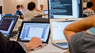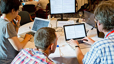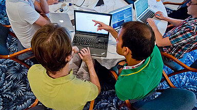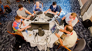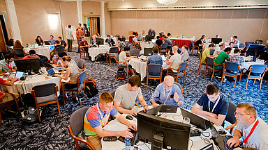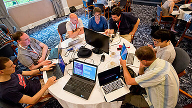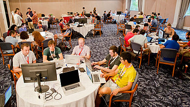 A hive of activity in the conference roomThe sound of fingers tapping away on keyboards and the endless murmuring of the scientists at work as they discussed matters in round table debates or stared fixedly at their computer screens could be heard coming from the large conference room at the Hotel de la Paix. The participants were divided into nine groups, each of which was supervised by two expert mentors, including computer specialists from the companies NVIDIA and Cray and employees of CSCS, the Oak Ridge National Laboratory and various university institutions.