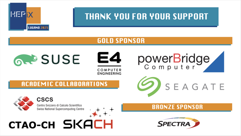 CSCS is grateful to have had the opportunity to host this vibrant community and thanks everyone who contributed to making the event a success. We would also like to extend our sincere thanks to the sponsors whose generous support helped make HEPiX Lugano 2025 possible. Their contributions were essential in creating a welcoming and productive environment for knowledge-sharing and collaboration.