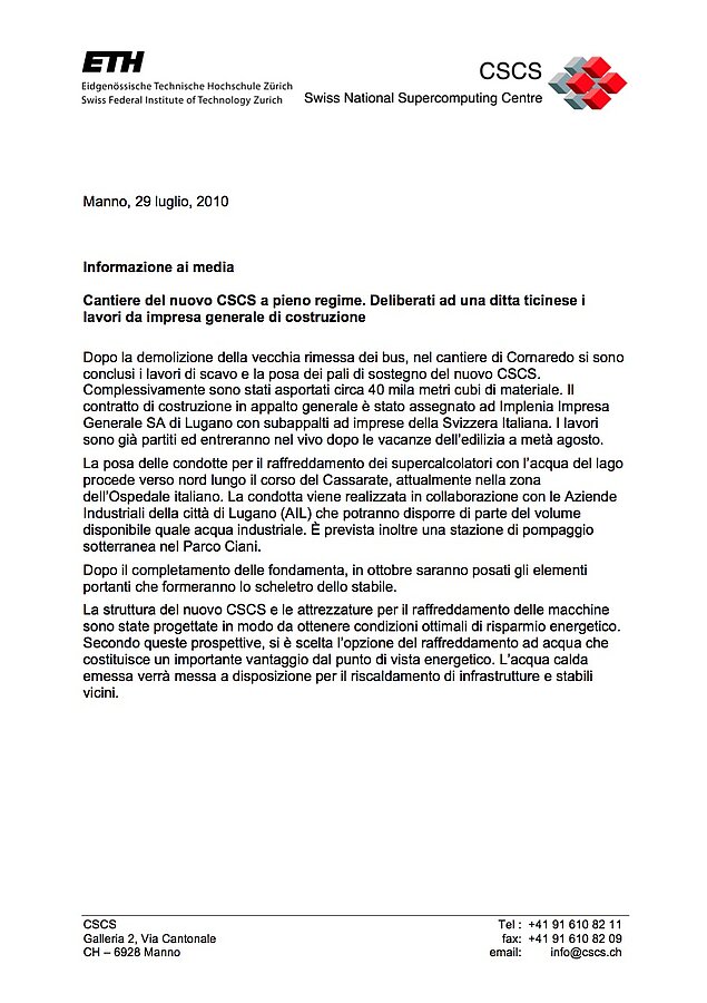 La posa delle condotte per il raffreddamento dei supercalcolatori con l'acqua del lago procede verso nord lungo il corso del Cassarate, attualmente nella zona dell'Ospedale Italiano. La condotta viene realizzata in collaborazione con le Aziende Industriali della Città di Lugano (AIL) che potranno disporre di parte del volume disponibile quale acqua industriale. È prevista inoltre una stazione di pompaggio sotterranea nel Parco Ciani.
