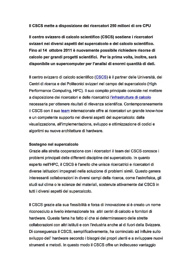 The Swiss National Supercomputing Centre (CSCS) is the High Performance Computing (HPC) partner for Swiss technical universities, universities and federal research entities. Its core mission is to provide scientists with the compute infrastructure they need. In this context, CSCS with its international team offers scientists important know-how and competent support in HPC, visualisation, the implementation of codes on the computers as well as with the continuous development and optimisation of codes and algorithms on new computer architectures.