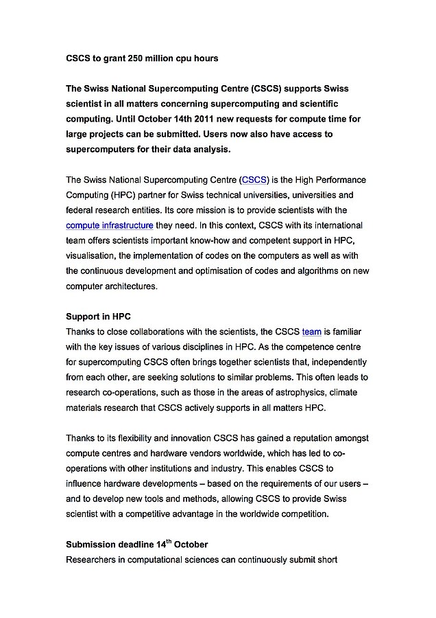 Researchers in computational sciences can continuously submit short preparatory projects to CSCS. For large projects with a duration of up to three years, scientist can apply for compute time every 6 months. The current call for proposals closes on October 14th 2011 and will see 250 million cpu hours allocated amongst Swiss institutions starting April 1st 2012.