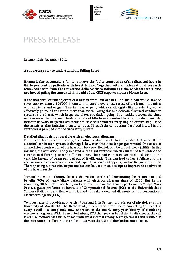 “Modern simulation methods coupled with supercomputers offer us new insights into physical, or in this case medical, processes,” says Rolf Krause, Director of the ICS. “With the interdisciplinary approach in the computational sciences, mathematicians, computer scientists and physicians can work hand in hand to improve the existing therapies for heart disease and develop new ones in the long run.”