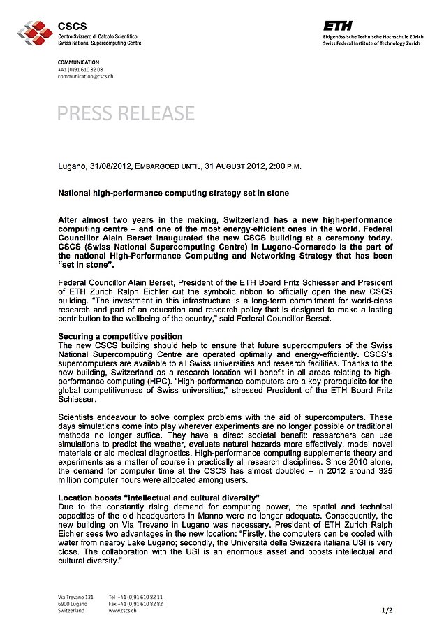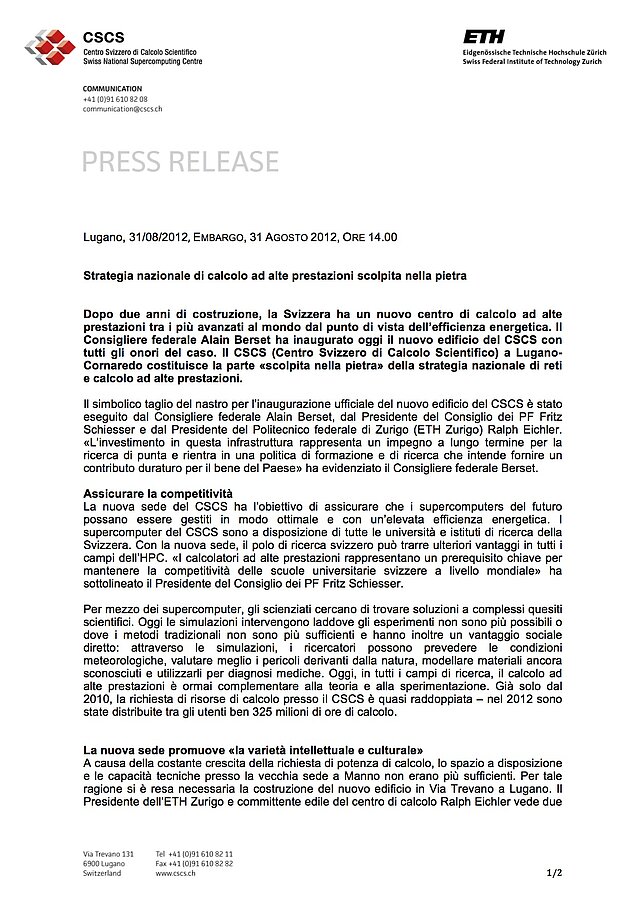 Due to the constantly rising demand for computing power, the spatial and technical capacities of the old headquarters in Manno were no longer adequate. Consequently, the new building on Via Trevano in Lugano was necessary. President of ETH Zurich Ralph Eichler sees two advantages in the new location: “Firstly, the computers can be cooled with water from nearby Lake Lugano; secondly, the Università della Svizzera italiana USI is very close. The collaboration with the USI is an enormous asset and boosts intellectual and cultural diversity.”