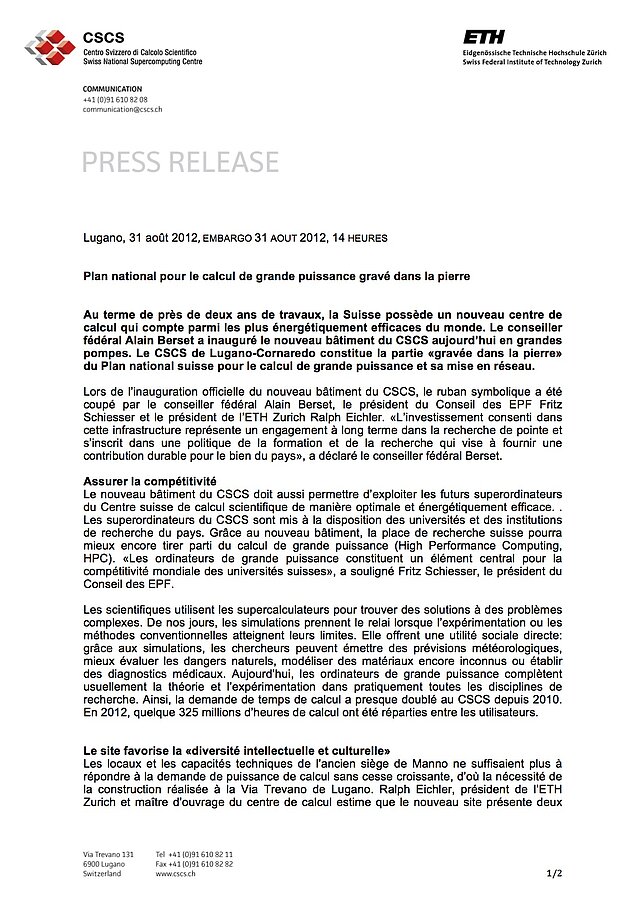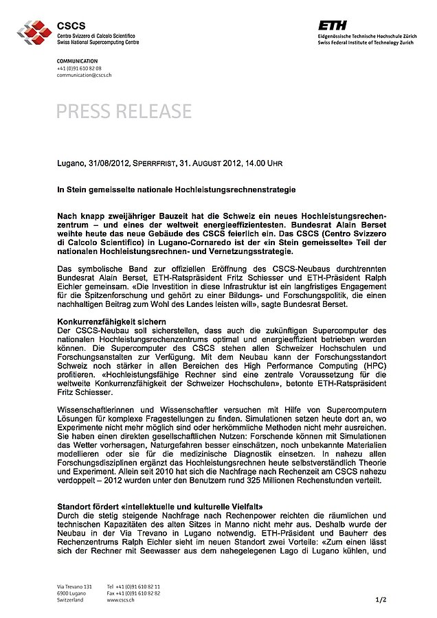 The new CSCS building should help to ensure that future supercomputers of the Swiss National Supercomputing Centre are operated optimally and energy-efficiently. CSCS’s supercomputers are available to all Swiss universities and research facilities. Thanks to the new building, Switzerland as a research location will benefit in all areas relating to high-performance computing (HPC). “High-performance computers are a key prerequisite for the global competitiveness of Swiss universities,” stressed President of the ETH Board Fritz Schiesser.