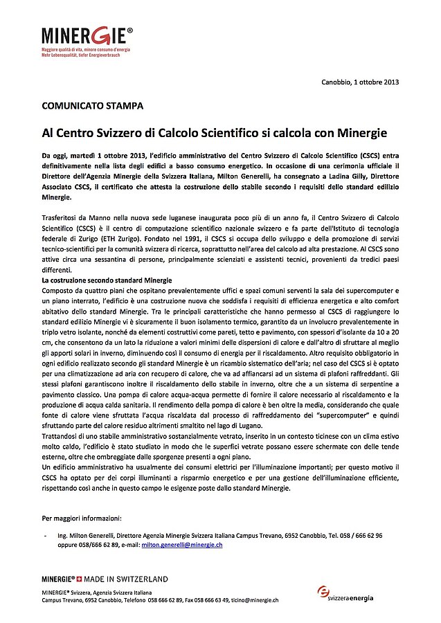 Composto da quattro piani che ospitano prevalentemente uffici e spazi comuni serventi la sala dei supercomputer e un piano interrato, l’edificio è una costruzione nuova che soddisfa i requisiti di efficienza energetica e alto comfort abitativo dello standard Minergie. Tra le principali caratteristiche che hanno permesso al CSCS di raggiungere lo standard edilizio Minergie vi è sicuramente il buon isolamento termico, garantito da un involucro prevalentemente in triplo vetro isolante, nonché da elementi costruttivi come pareti, tetto e pavimento, con spessori d’isolante da 10 a 20 cm, che consentono da un lato la riduzione a valori minimi delle dispersioni di calore e dall’altro di sfruttare al meglio gli apporti solari in inverno, diminuendo così il consumo di energia per il riscaldamento. Altro requisito obbligatorio in ogni edificio realizzato secondo gli standard Minergie è un ricambio sistematico dell’aria; nel caso del CSCS si è optato per una climatizzazione ad aria con recupero di calore, che va ad affiancarsi ad un sistema di plafoni raffreddanti. Gli stessi plafoni garantiscono inoltre il riscaldamento dello stabile in inverno, oltre che a un sistema di serpentine a pavimento classico. Una pompa di calore acqua‐acqua permette di fornire il calore necessario al riscaldamento e la produzione di acqua calda sanitaria. Il rendimento della pompa di calore è ben oltre la media, considerando che quale fonte di calore viene sfruttata l’acqua riscaldata dal processo di raffreddamento dei “supercomputer” e quindi sfruttando parte del calore residuo altrimenti smaltito nel lago di Lugano. Trattandosi di uno stabile amministrativo sostanzialmente vetrato, inserito in un contesto ticinese con un clima estivo molto caldo, l’edificio è stato studiato in modo che le superfici vetrate possano essere schermate con delle tende esterne, oltre che ombreggiate dalle sporgenze presenti a ogni piano. Un edificio amministrativo ha usualmente dei consumi elettrici per l’illuminazione importanti; per questo motivo il CSCS ha optato per dei corpi illuminanti a risparmio energetico e per una gestione dell’illuminazione efficiente, rispettando così anche in questo campo le esigenze poste dallo standard Minergie.