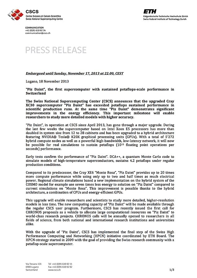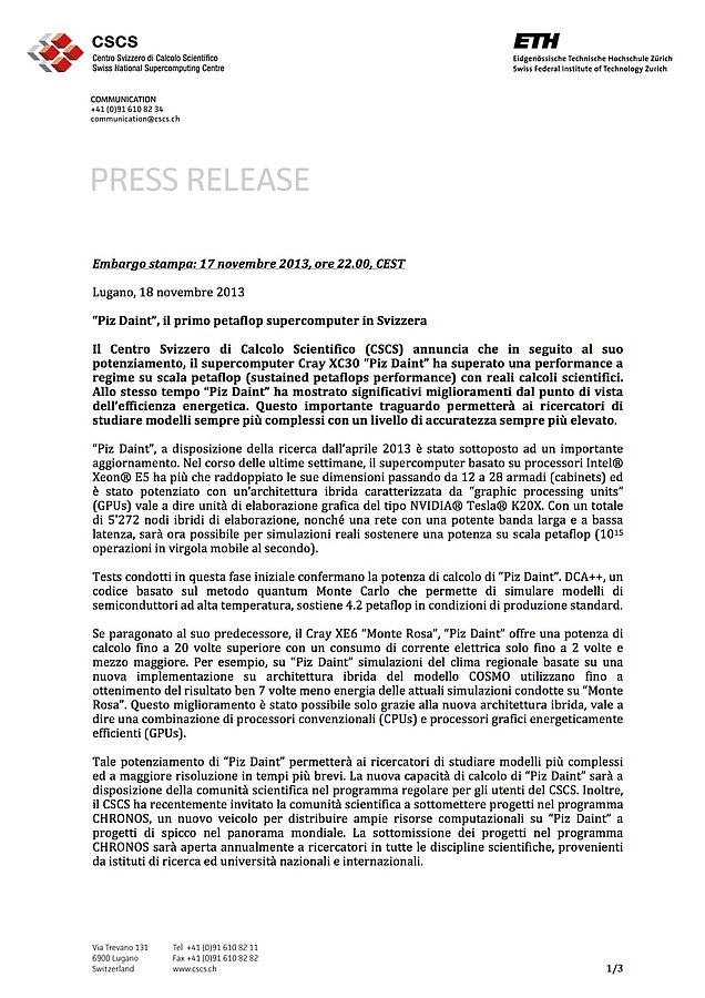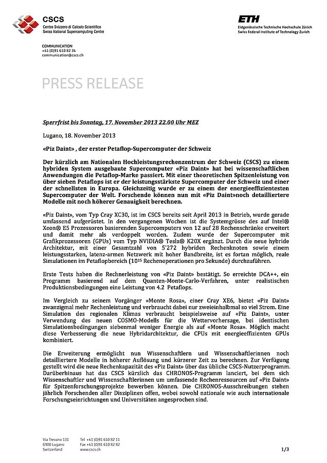 This upgrade will enable researchers and scientists to study more detailed, higher-resolution models in less time. The new computing capacity of “Piz Daint” will be made available through the regular CSCS user program. Furthermore, CSCS has recently issued the first call for CHRONOS proposals as a vehicle to allocate large computational resources on “Piz Daint” to world-class research projects. CHRONOS calls will be annually opened to researchers in all fields of science, from both national and international research institutions and universities alike.
