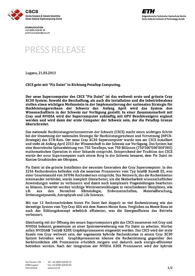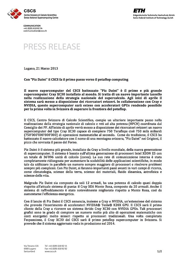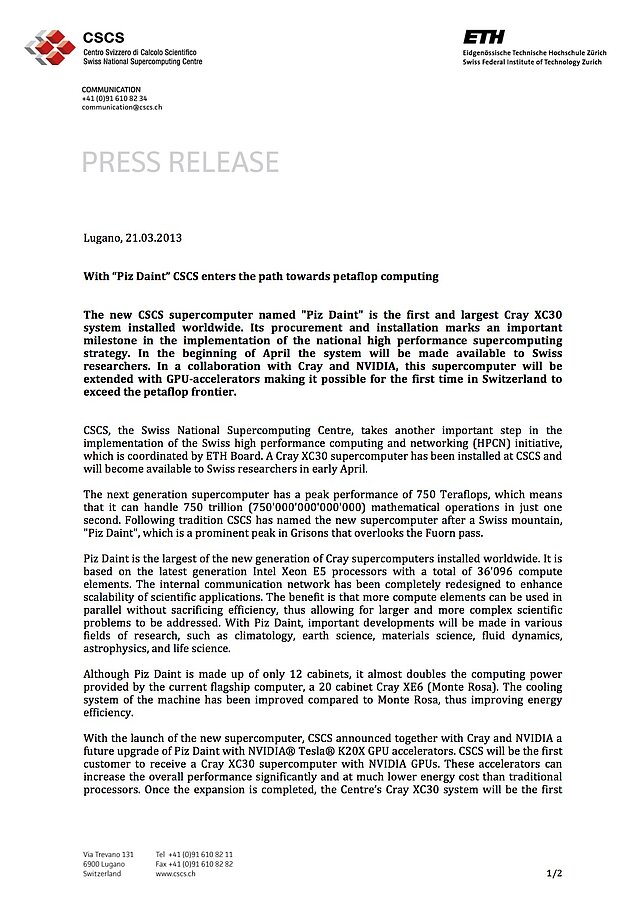 Thomas Schulthess, Director of CSCS, comments on the installation of the new supercomputer, "A great team effort at the beginning of 2013 allowed us to get Piz Daint running in just 3 months, and make one of the most advanced supercomputers in the world available to Swiss researchers. I am very happy about this remarkable achievement, which has followed a very intense year of 2012 that saw the completion and the move into our new computer center in Lugano. The new system will enable researchers to solve ever more complex problems, be it in the search for new materials, in the prediction of climate changes, or in other disciplines. With the planned GPU acceleration, the application performance and the energy efficiency of our simulations will improve significantly. We are very excited about the collaborative development with Cray and NVIDIA of a truly general purpose hybrid multi-core system”.