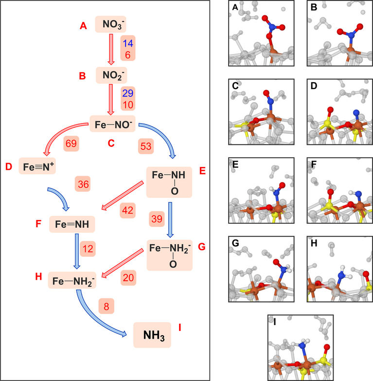 According to the researchers, the simulations show that nitrate anions on pyrite can be converted to ammonia step by step through the transfer of individual atoms, whereby the pyrite surface is a major participant in the reaction. The mineral assists the process by binding the nitrogen-containing reagents to itself while the chemical reaction is taking place. It is thus responsible both for encouraging the reaction to complete and for facilitating it in the first place.