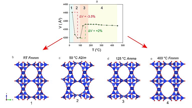The STI zeolites now studied by the researchers at the University of Bern consist of a system of two-dimensionally interconnected channels. The cavities contain cations (positively charged ions), which can be easily exchanged with other ions. In their complex multi-method study, the research team used a natural zeolite with STI framework type whose original cations were replaced by lead (Pb) in the experiment—so-called lead-exchanged (Pb-exchanged) stellerites. When these Pb-zeolite forms were heated, the researchers observed that the crystals initially contracted continuously, as expected. However, it unexpectedly expanded again to its original volume with its original symmetry at a temperature of above 125°C.