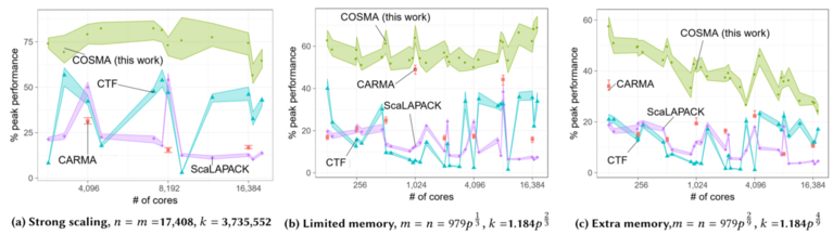 It is difficult to find a more abundant computation kernel than matrix multiplication. Studied for decades, with plethora of works both on theoretical analysis and efficient implementations, it may be surprising that this topic is not closed yet. However, researchers from Swiss National Computing Center and ETH Zurich found out that the existing BLAS libraries are often not efficient, especially in cases of non-square matrices, which naturally arise in a vast number of scientifically significant scenarios, e.g. in machine learning or quantum simulations. Furthermore, most of the existing implementations require careful fine-tuning of library-specific parameters in order to achieve decent performance, thus making it hard for scientists to take the best out of them, often resulting in a performance which is far from the optimal. The team presented a novel approach to speed-up the multiplication for matrices of any shape, which provably minimizes the necessary communication between the computing nodes. Their algorithm, called COSMA, outperforms the existing libraries up to an order of magnitude in some cases due to minimized communication and highly optimized implementation.