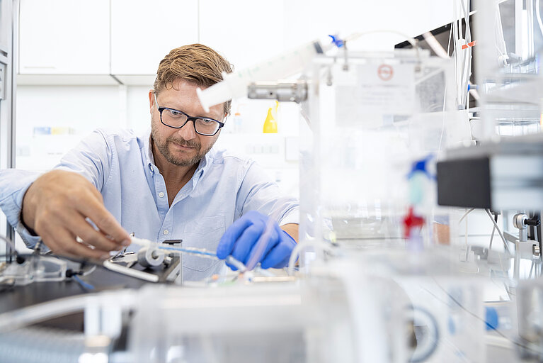 About 15 years later, Obrist now conducts research in a state-of-the-art building within walking distance of the Inselspital, Bern University Hospital. As his institution is part of the medical faculty, he is convinced that the position he has today is unique in Switzerland, with barely anything similar worldwide. He is proud of his close collaboration with medicine and the direct exchange with doctors, who sometimes take him along to the operating room. There, they can outline specific issues live with a patient, or his team can take measurements and collect data from the patient during surgery. It is also not uncommon for doctors to call him with a question, which then turns into a project. This translation is routine within Obrist's work group, i.e. developing an idea discussed at the operating table or between the doctor and engineer, using it as the basis for a simulation and experiment, and then engineering it into a technical solution – a product. “I always wanted a professorship because I wanted the freedom to test things out,” says the professor.