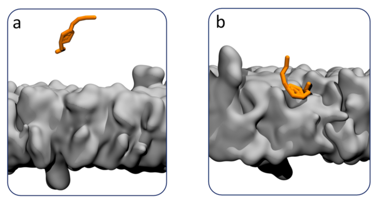 Specifically, the team’s application calculates the free-energy landscape of the binding process, revealing where and how molecules are most likely to insert into the membrane. The two molecules known to provide protection against toxic amyloid aggregates are the aminosterols trodusquemine (TRO) and squalamine (SQ), so both compounds are being studied intensively for their potential in Alzheimer’s and Parkinson’s treatment.