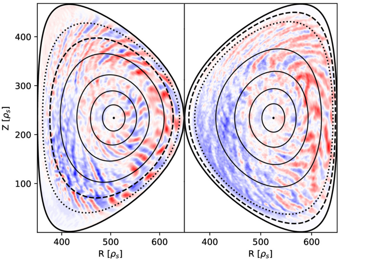 LV: The plasma in a reactor is always donut-shaped, but it can have different forms in the cross section, like circular, elongated, square or D-shaped. We are still working towards understanding the influence of this shape. For one, in a series of simulations, we investigated D-shaped plasma and found that the orientation of this shape — meaning like a D, or like an inverted D — plays a crucial role. Both our simulations and experiments in TCV at EPFL showed that turbulence decreases by a factor of two in a plasma with inverted D-shape. This is a huge improvement.