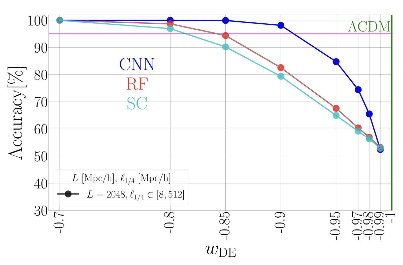 The results showed that the approach using the CNN outperformed the Random Forest algorithm in accuracy. The team saw up to 40 percent improvement in detecting dark energy in the simulations. In addition, the CNN approach required smaller portions of simulated universe — and thus less data — to achieve a useful prediction accuracy.